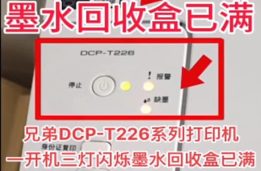 兄弟 DCP-T226 系列打印机出现三灯闪烁、提示墨水回收盒已满的故障,导致打印机无法正常打印,这是打印机内置废墨计数器达到上限触发的保护机制,出现该问题原因是墨水回收盒长期收集喷头清洗、开关机初始化产生的废墨,内部废墨计数器累积计数达到出厂预设阈值,进而锁定打印功能。
